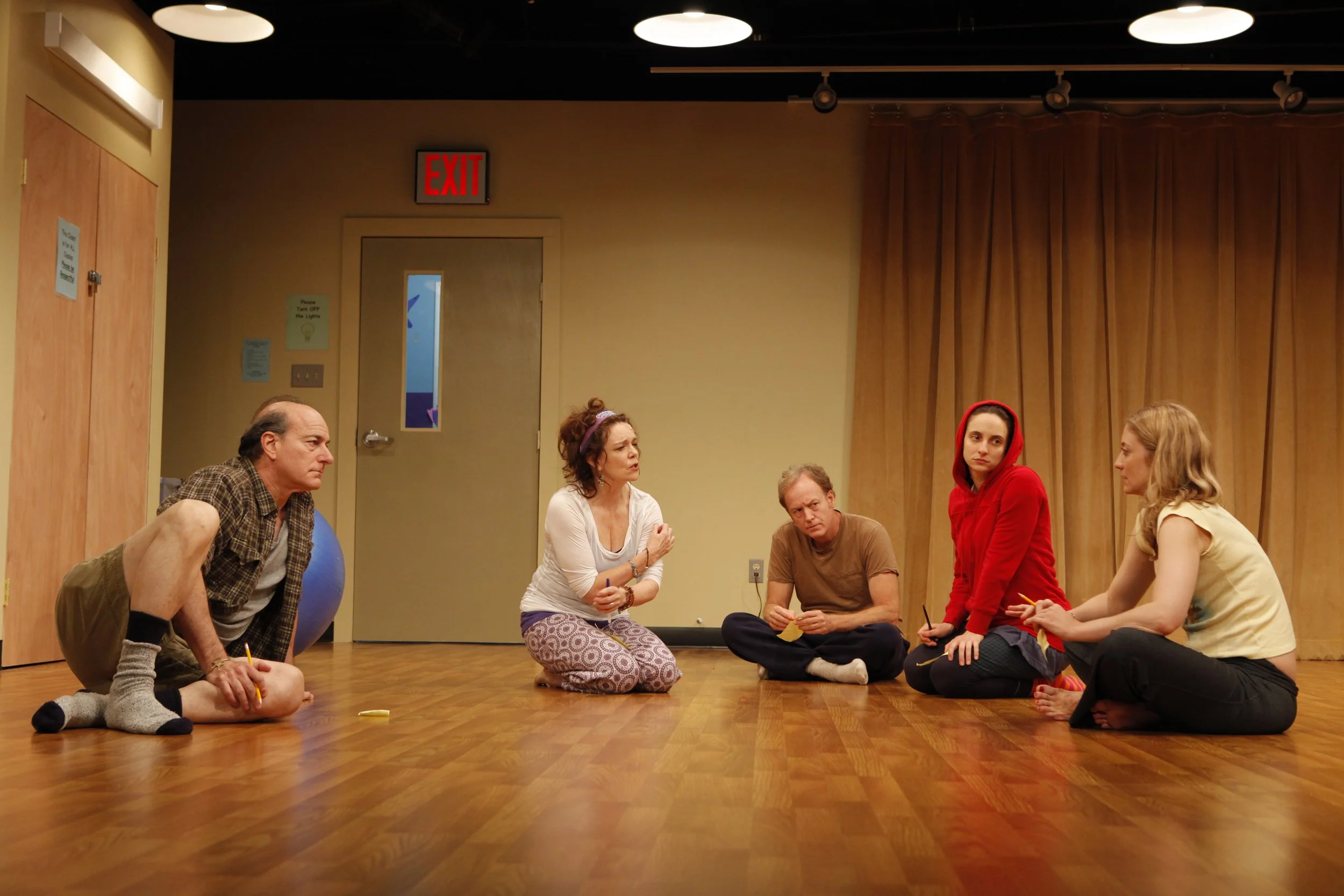 Peter Friedman, Deirdre O’Connell, Reed Birney, Tracee Chimo, and Heidi Schreck in Circle Mirror Transformation at Playwrights Horizons in 2009. Photo: Joan Marcus.