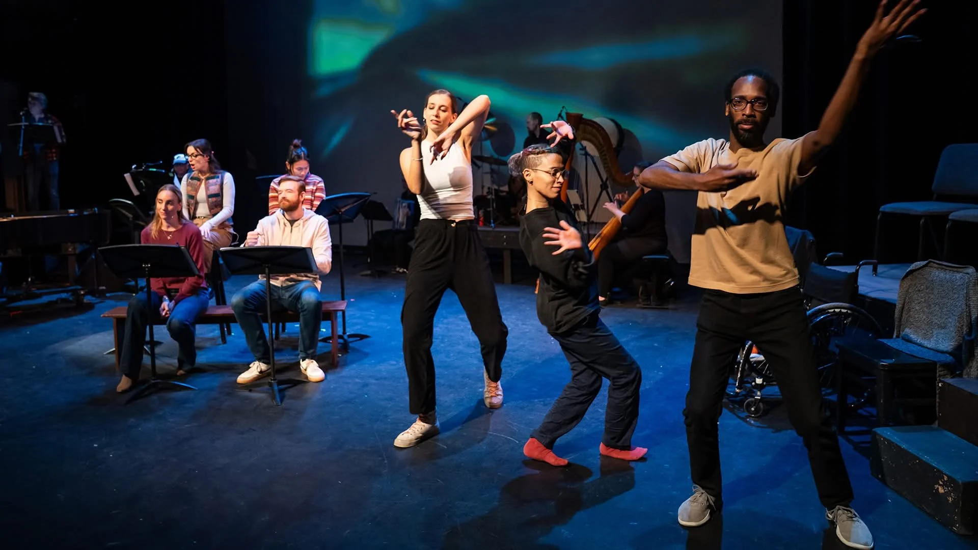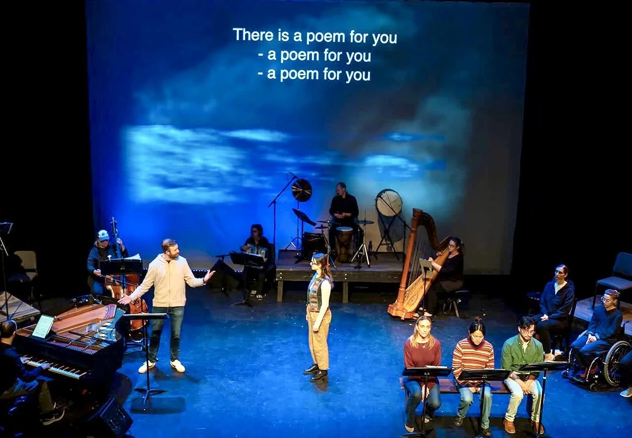 The song cycle incorporates artful open captions, sign language, and visual music embedded into the stage picture. Photo: Arden Dickson.